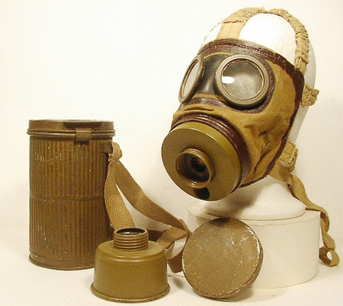 mit Ventil- atmung, Dichtrahmen und verstellbarer 7 Punkt-Federzugbaenderung. Die Augenpartie wurde extra eingesetzt, die "Augenglaeser" waren aus Zellon, hier mit Metallverstaerkung, um den Explosionsdruck abzufangen. Eine ganz aehnliche Maske wurde nach dem Krieg unter der Bezeichnung RSc in Polen gefertigt. |