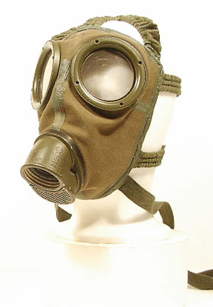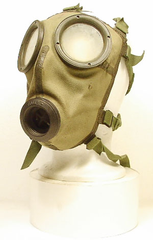 | Vollmaske 735, 1961Gummibeschichtetes Gewebe, Federzug Baenderung, Augenglaeser Einfassung geschraubt, Anschluss-Stueck aus Kunststoff sonst baugleich wie bei GM 54 |