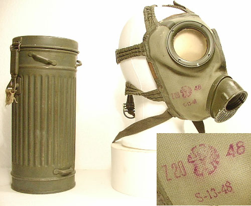 | GM-30 von AUER hergestellt und 1948 von den tschech. Behoerden geprueft und wieder in Dienst gestellt. Die Tragebuechsen wurden olivgruen lackiert und auch die Filter wurden geprueft und wiederverwendet. Die Beutestuecke wurden nicht entnazi- fiziert wie es in der DDR und BRD ueblich war |