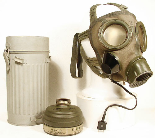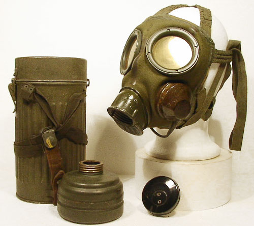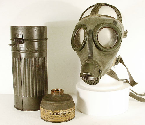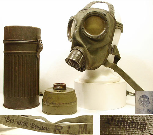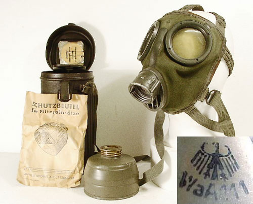 noralerweise sind die GM-30 bis 1943 auf der Innenseite mit hellgrauem, fast weissem Gummi beschichtet, Buechse von 1934, Gasmaske und Filter haben kein Herstellungs- datum gestempelt |
