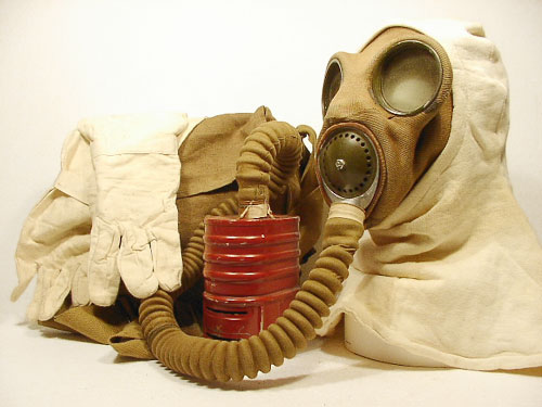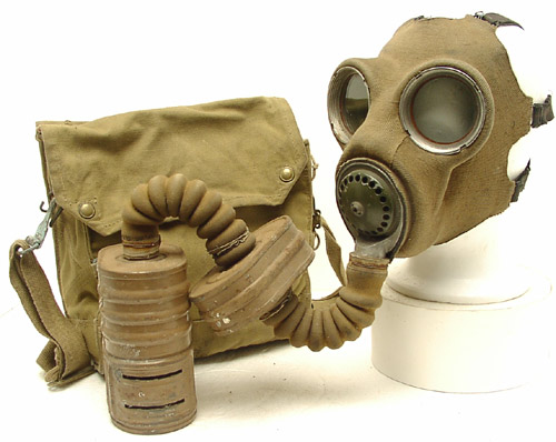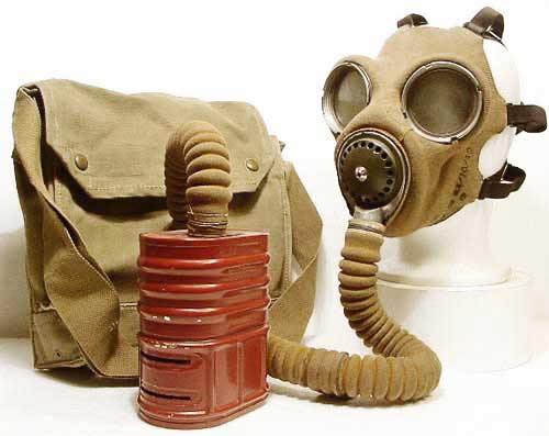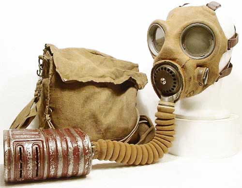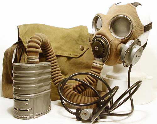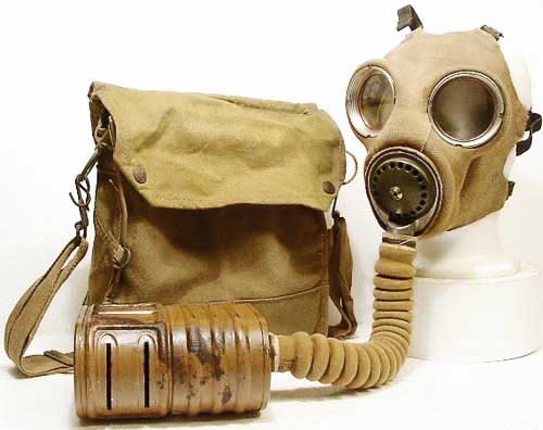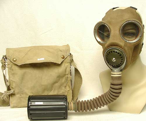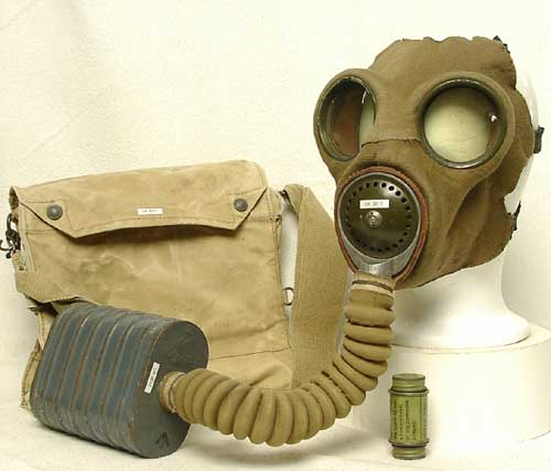 | Mk IV mit ungewoenlichem Filter ( Typ F ) und Mk V Tasche, diese Maske wurde vom aktiven Luftschutz verwendet. |